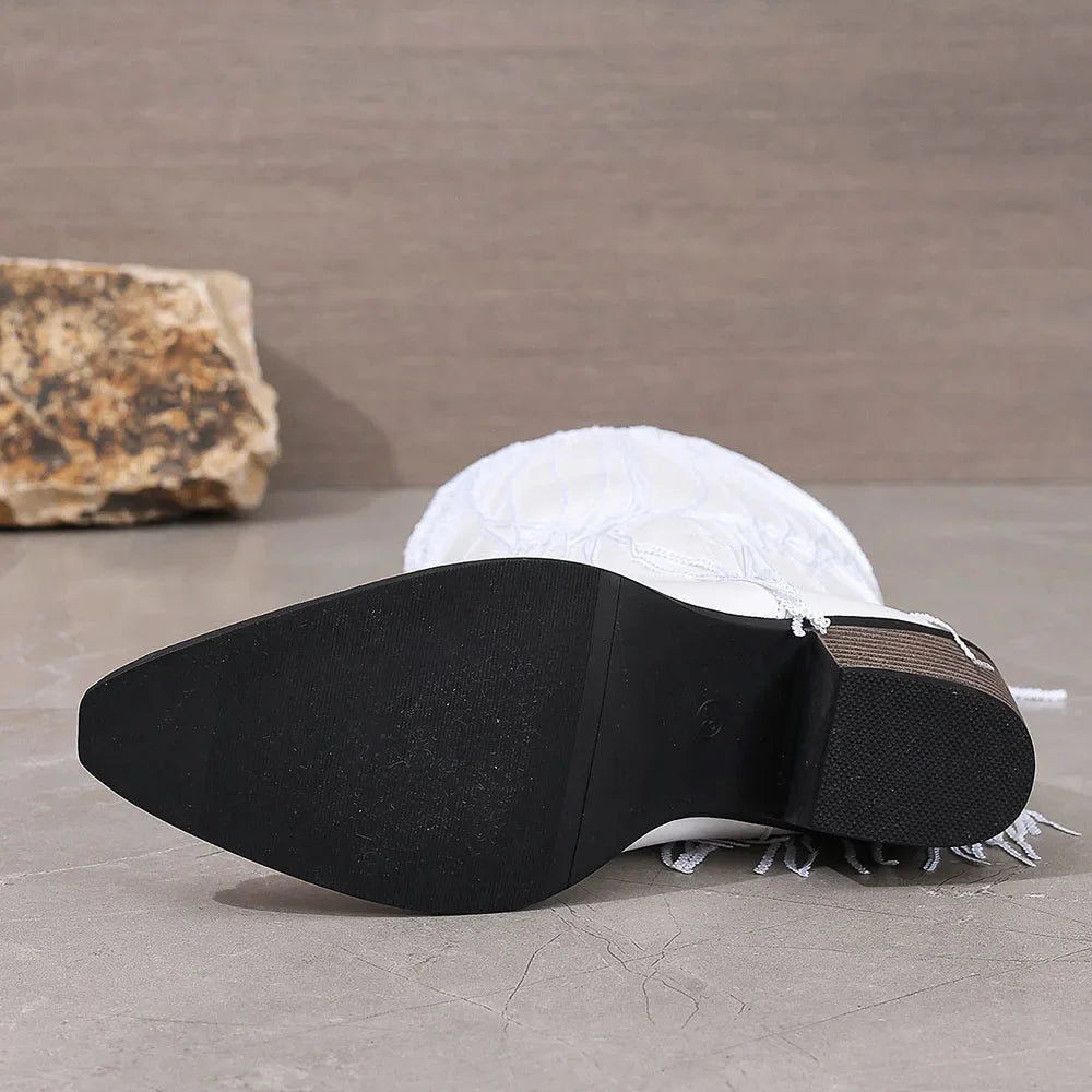 The Savanna Fringe Boots bring Western flair to any outfit with their flowing fringe, metallic finish, and pointed toe silhouette. Finished with a sturdy block heel for all-day comfort and confident strides.